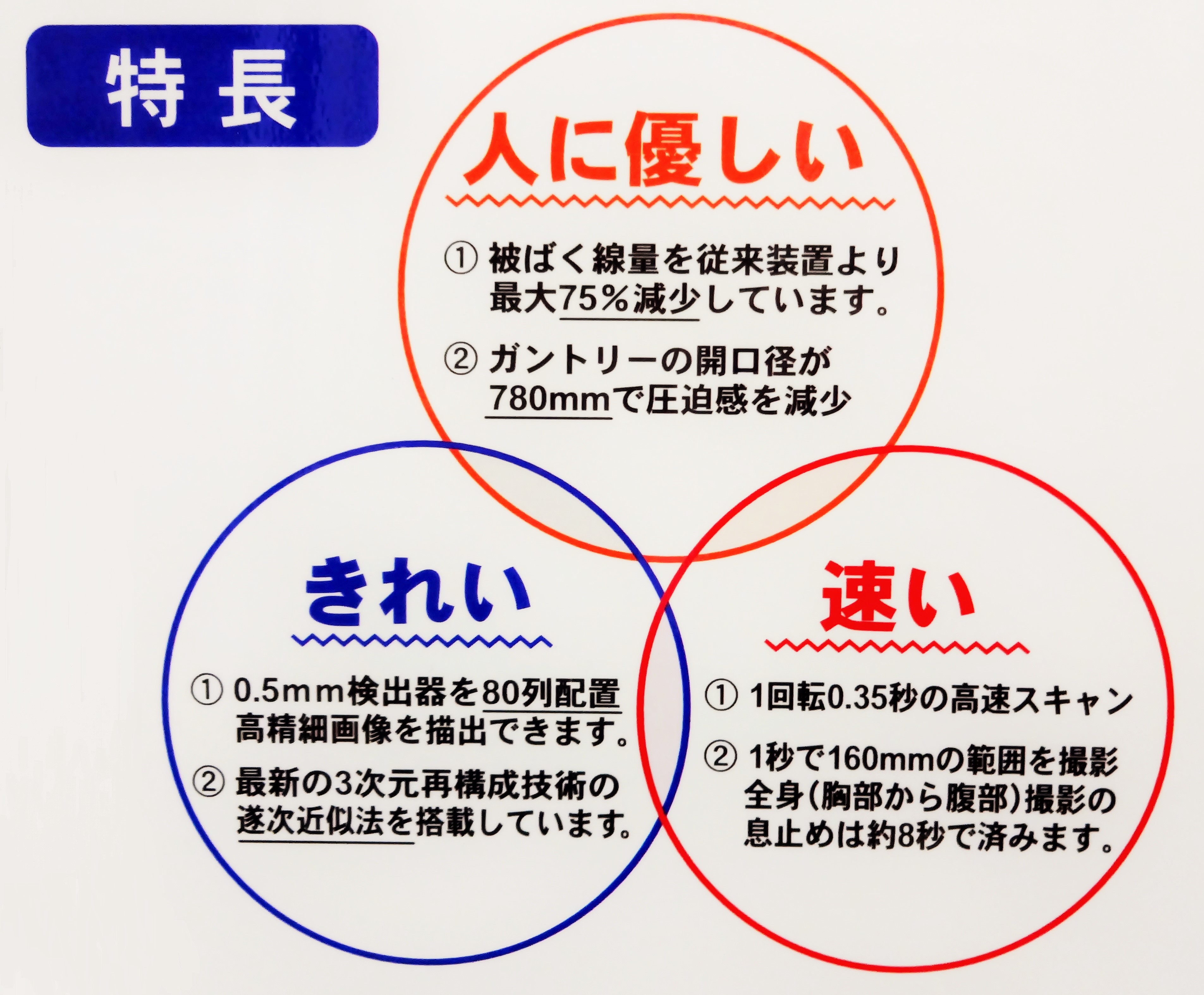 さらに高画質を実現しながらも従来の装置に比べて、最大1/4という「低被爆」を実現し、患者様への影響も考慮された、患者様に優しい検査です。